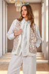 Un chaleco sin mangas con bordado artesanal que aporta un toque de sofisticación moderna y elegancia versátil, ideal para combinar con camisas, vestidos o tops ajustados.