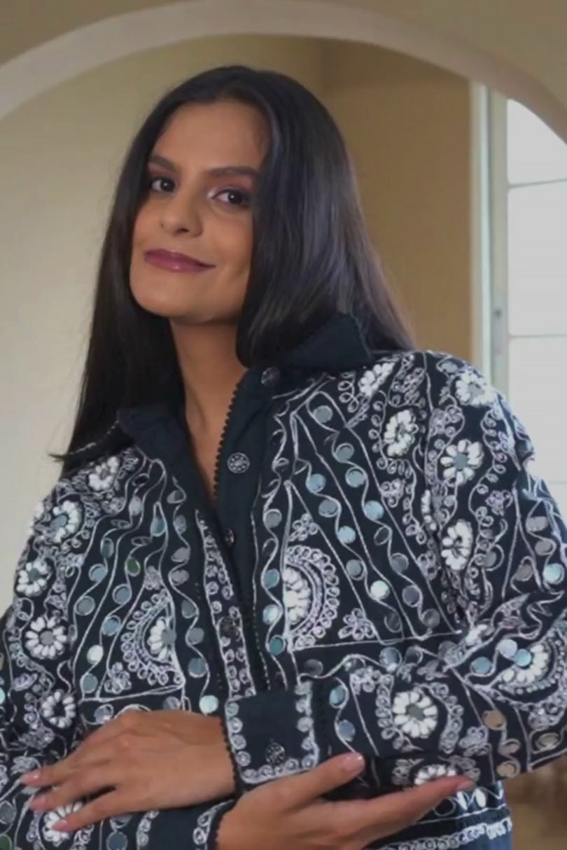 Una chaqueta ligera y elaborada con bordados minuciosos que unen elegancia y confort, ofreciendo una caída suave y un estilo refinado que realza cualquier conjunto.