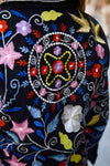 Una chaqueta artesanal de inspiración bohemia con bordados florales multicolor sobre base oscura, que refleja la fuerza del arte hecho a mano y el encanto contemporáneo.