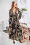 El diseño presenta un escote en V profundo, mangas abullonadas con puños ajustados y una cintura fruncida que realza la silueta sin perder comodidad. La falda larga, compuesta por varias capas delicadas, genera un movimiento natural que aporta dinamismo y feminidad. Cada detalle de este vestido refleja la dedicación del trabajo manual y la inspiración en los bordados tradicionales reinterpretados con una mirada moderna.